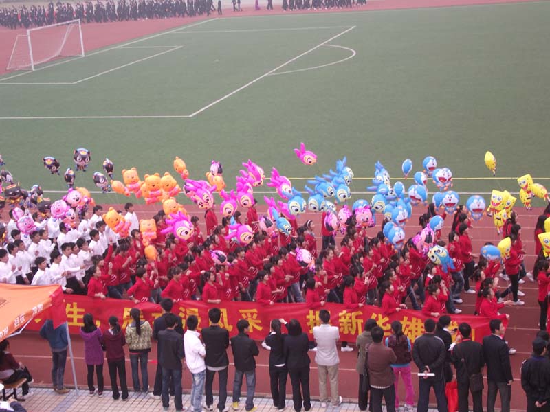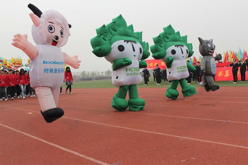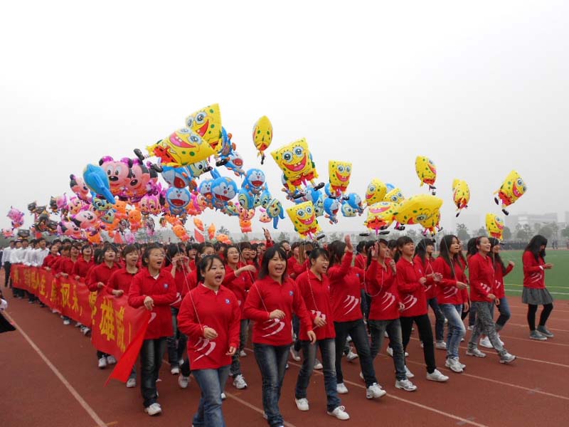 “激昂动漫,辉煌灿烂;奋力拼搏,勇夺桂冠。”在同学们的掌声和期待中,动漫学院方阵在动漫学院行政副院长朱诵贵,动漫学院院长助理许存福和动漫学科带头人刘国宏的带领下昂首阔步地走向主席台。方队由200名学生组成,“福娃”“机器人”“喜洋洋与灰太狼”等卡通人物形象的出现成为整个运动会场的一大亮点,而每个学生手中的卡通人物形象也各具特色。这样一个具有动漫学院特色的方阵的出现无疑将会场的气氛推向了高潮。