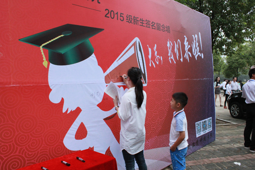 签名墙前新生纷纷签名留恋,并和学长学姐们合影,给自己的大学之路记录一个起点。