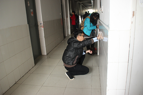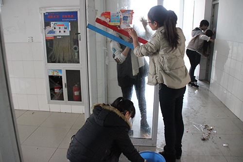 周三下午,活动正式开始。同学们不怕脏不怕苦,人人动手。玻璃、门框上面灰尘落了厚厚地一层,同学们先用湿布擦干净,再用报纸擦亮。小广告难以清除,指导老师到场示范清理方法,大家找来钢丝刷等工具,先刷、再洗、最后擦净。有的同学衣服上沾满了污渍,但是大家没有因此而降低工作标准。集中清扫结束后,学院还组织了自查自纠,力求达到最好效果。经过大家的共同努力,宿舍楼面貌焕然一新。