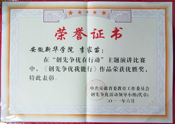 日前在由安徽省委创先争优活动领导小组、省委组织部、省委宣传部联合开展的“创先争优在行动”主题征文演讲比赛中,我院2009级动画(2)班李家苗同学表现出色,获得优胜奖。