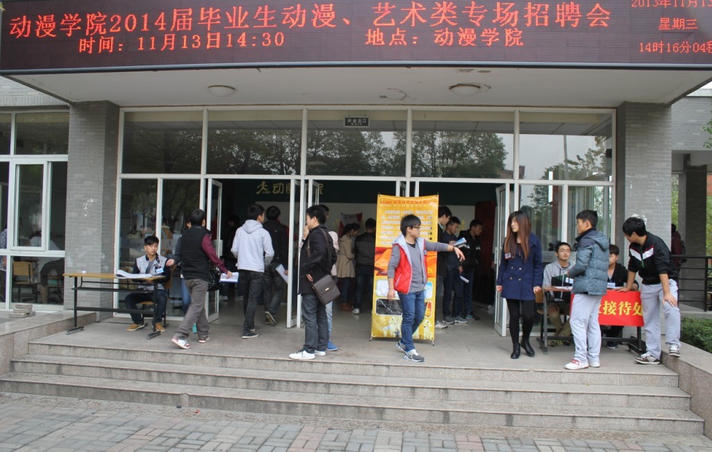 为积极推进我院毕业生就业工作,提供高质量的就业平台,11月13日下午,动漫学院在教学楼大厅举办了2014届毕业生动漫、艺术类专场招聘会。安徽三美动漫、梦克斯数码、华乐互动信息科技、华策广告传媒、皖家美装饰工程等二十余家、工大动漫、艺术类大中型企业为毕业生提供了100余个就业岗位,吸引了200余名毕业生前来应聘。
