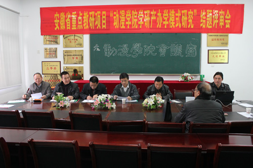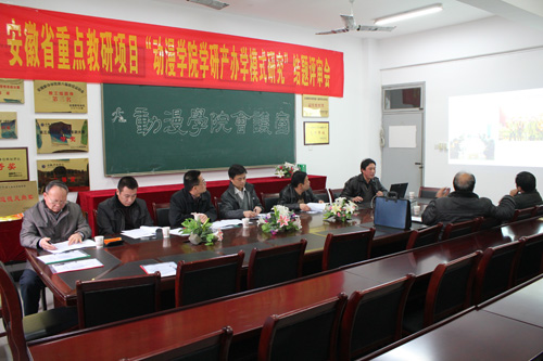 会议主要对安徽省重点教研项目“动漫学院学研产办学模式研究”进行结题评审。吕新生首先向到会专家介绍了本次会议的背景,随后许存福从项目的初期调研、中期建设、特色凝练、推广应用、进一步研究五个方面详细地向到会专家汇报了“动漫学院学研产办学模式研究”项目的开展情况以及所获得的成果和成果的推广应用。各位专家也一一对项目的开展情况进行了提问,项目组成员针对专家们的提问进行了详实的解答,得到了到会专家的一致肯定。
