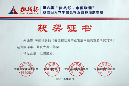 6月4日至6日,由共青团安徽省委员会、安徽省教育厅、安徽科学技术协会、安徽省学生联合会共同主办的第六届“挑战杯”安徽省大学生课外学术科技作品竞赛终审决赛在安徽大学举行。经过激烈角逐,我院朱诵贵副院长指导的袁磊、冯灀、邢慧、阮从芳四位同学的作品《安徽省动漫产业发展问题调查及研究对策》喜获荣获二等奖。这也是我院在“挑战杯”课外学术科技作品竞赛中取得的历史最好成绩。