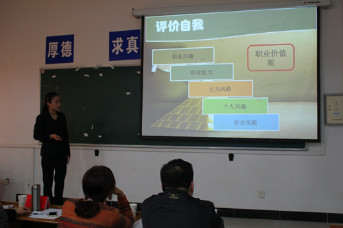 比赛过程中,选手们在台上挥洒自如,精美的课件,落落大方的神态,巧妙的回答,凸显了大学生较高的综合素质和良好的精神面貌。现场掌声不断,高潮迭起。在点评环节,王力平老师对参赛选手朝气蓬勃的精神面貌、新颖独特的规划思路和激情四射的演说给予了充分赞扬,同时也针对各个选手的缺陷提出了中肯的建议:要注意在演说时的语气、语速、面部表情以及身体语言的把握; PPT作为表现形式应以简洁大方,最好能加入多媒体内容,各个部分紧密结合形成一个有机的统一体。