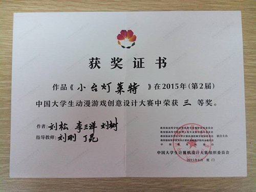 (本网讯)(通讯员:刘刚)近日,第二届中国大学生动漫游戏创意设计大赛中传来喜讯。由我院刘刚、丁昆老师指导, 2012级学生刘松、李三洋、刘树三人完成的作品《小台灯莱特》获得全国三等奖。这是我院今年在学科专业竞赛中取得的又一项全国性奖项。