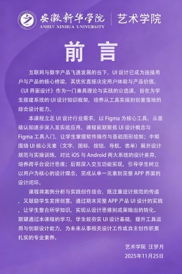 《UI界面设计》是一门兼具理论与行业实践的课程,立足UI设计岗位,以Figma为核心工具搭建教学体系:前期从UI设计概念与软件操作入门开始筑牢基础,中期围绕文字、图标等核心元素讲解规范,并对比不同系统之间的设计差异,培养跨平台思维,后期聚焦交互功能与用户核心理念,引导学生完成从单一元素到完整APP界面的设计闭环。课程采用“案例分析+实践创作”模式,既传递专业规范,也鼓励创意表达。