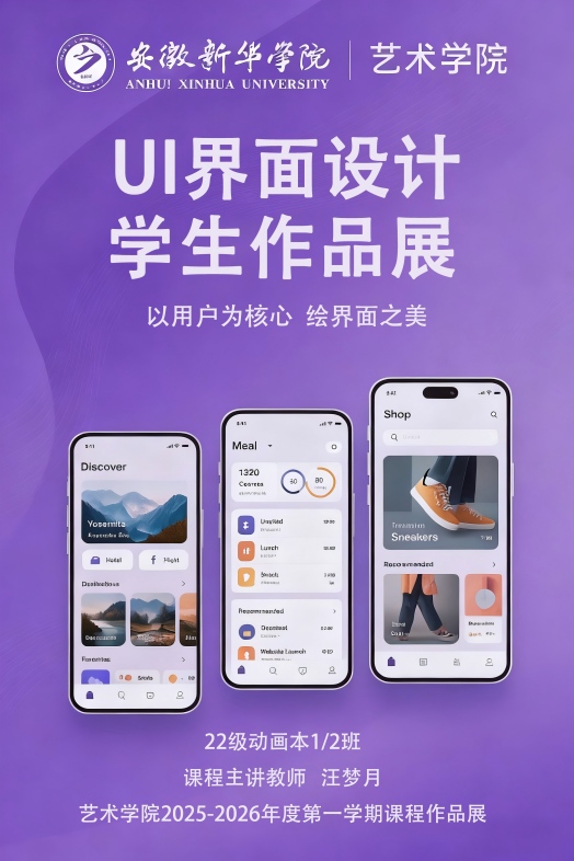 本网讯(通讯员:汪梦月)2025年11月25日,安徽新华学院艺术学院22级动画本1/2班《UI界面设计》课程作品展在艺术学院一楼大厅展示公开展示。本次展览是该课程2025-2026年度第一学期的实践成果呈现,由动画系教师汪梦月主讲指导。