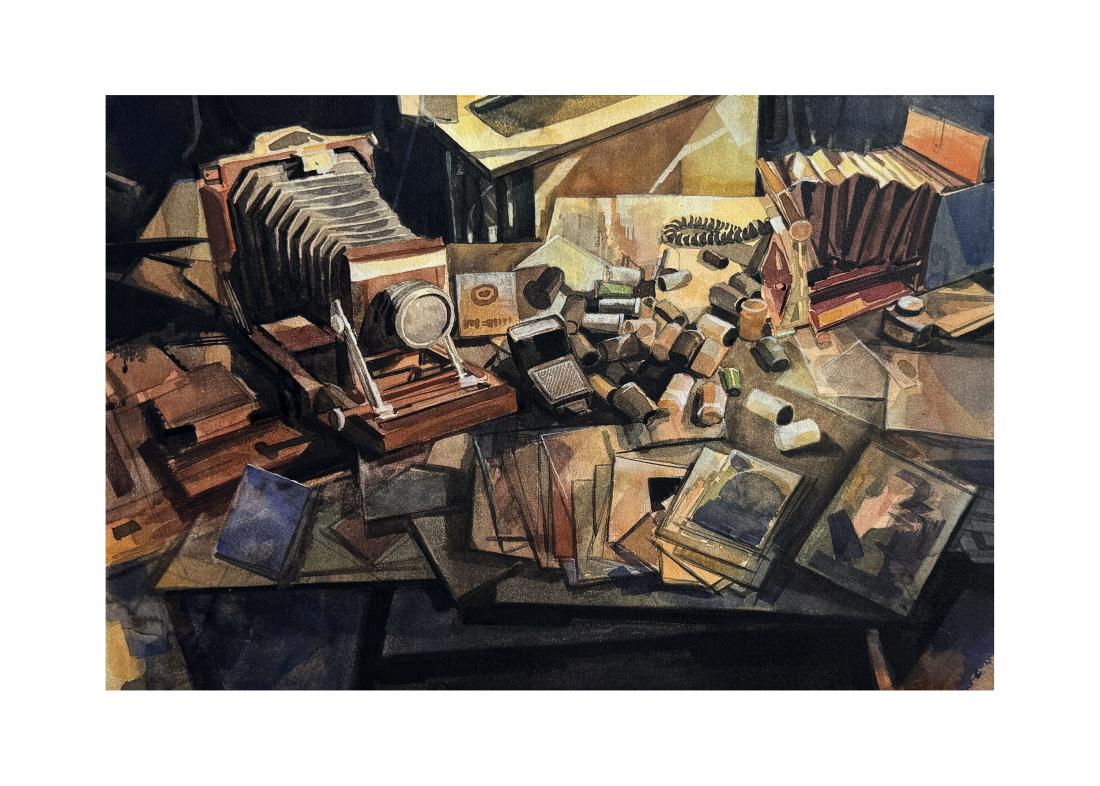 中国美术家协会艺委会学术研究展系列是国内美术界具有权威性和学术性的重要展览平台,旨在推动美术创作的学术探索与理论研讨,促进优秀艺术作品的传播与交流。第四届小幅水彩画展览以“凝练·多元·传承”为主题,聚焦水彩艺术的当代性表达,鼓励艺术家在有限尺幅中展现深厚的艺术功底与独特的创作理念。本次展览共收到全国数千件投稿作品,经过严格评审,最终遴选出百余件优秀作品参展,艺术学院王伟老师的作品《摄影师的工作台》凭借其鲜明的艺术风格和精湛的技艺脱颖而出。作品通过对工作台上琳琅满目摄影物件的精细描绘,发挥水彩润泽透明的色彩特性,运用现代构成形式的空间组合,使工作台产生温韾厚重的美感,并由物及人,使观众转而对摄影师的精神风貌与审美素养产生无限畅想,给人以情境交融之感。